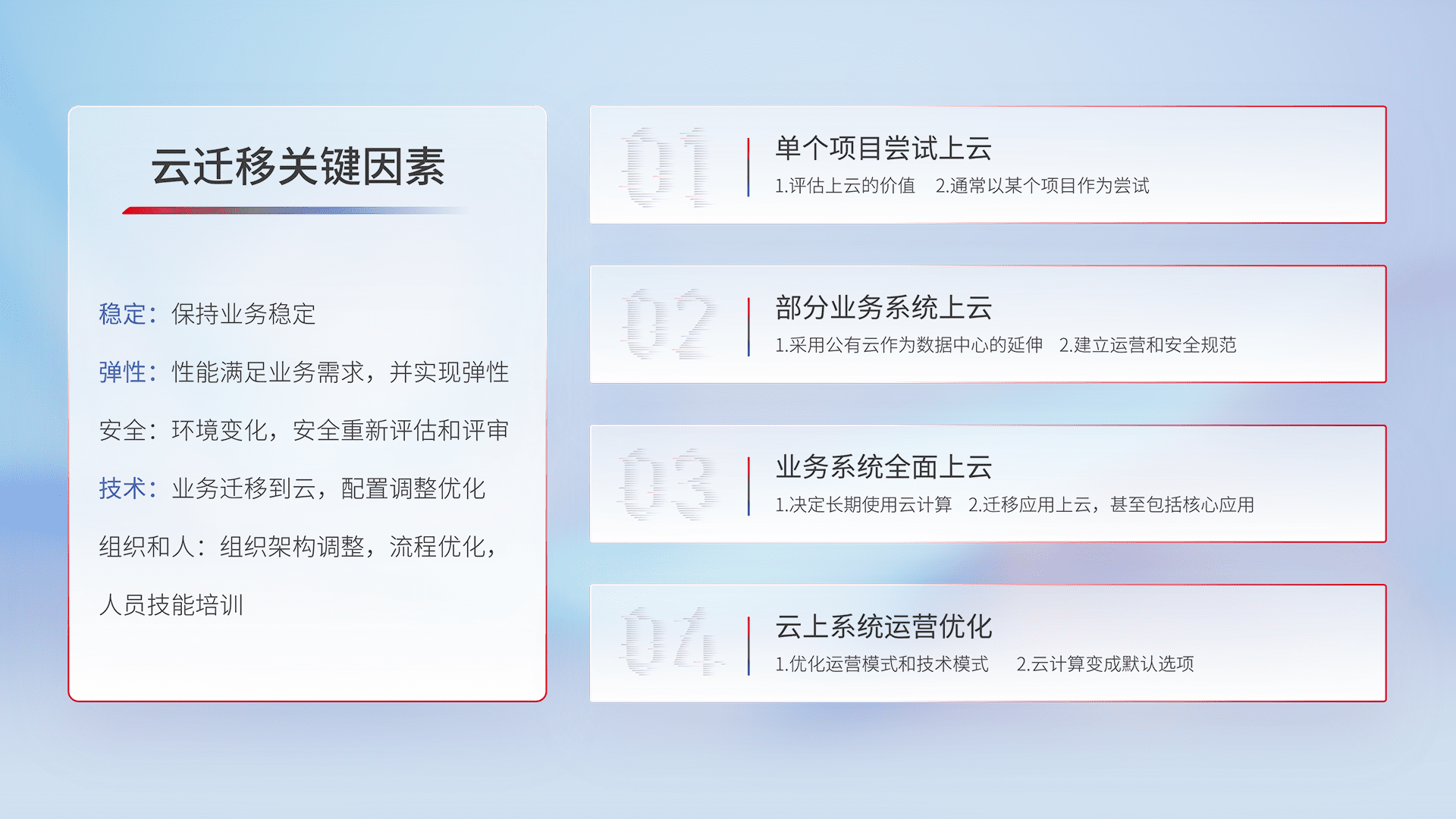结合实际业务,,从规划设计、、云平台选型、、云原生改造、、、数据迁移、、集成交付,,迁移全过程为客户识别最佳上云路径,,做好风险识别管理,,,,设计网络架构、、、身份权限、、、、安全审计合规、、、操作审计、、、日志审计、、监控告警策略、、、多站点容灾设计等,,,对云上基础设施进行整体规划,,,提升IT治理水平,,,以满足弹性、、、、高可用、、、高性能的需求。。。。